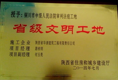 在公司領導層的指導下及項目部各人員的努力工作下,秉承務實求真高效的原則,由我公司承建的銅川市中級人民法院審判法庭工地被評為省級文明工地,榮獲省級文明工地榮譽證書。該項目由銅川市中級人民法院投資建設,由陜西建新項目管理咨詢有限公司負責監(jiān)理,由陜西省華源建筑工程有限責任公司承建。